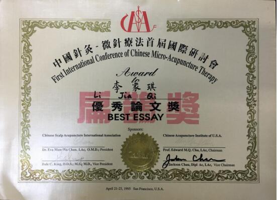 1995年在美国召开第一届“世界针灸微刺疗法”国际会议,李家琪教授荣获最高学术奖“扁鹊奖”。并应邀去美国医学最高机构“美国医学科学院”讲学交流。